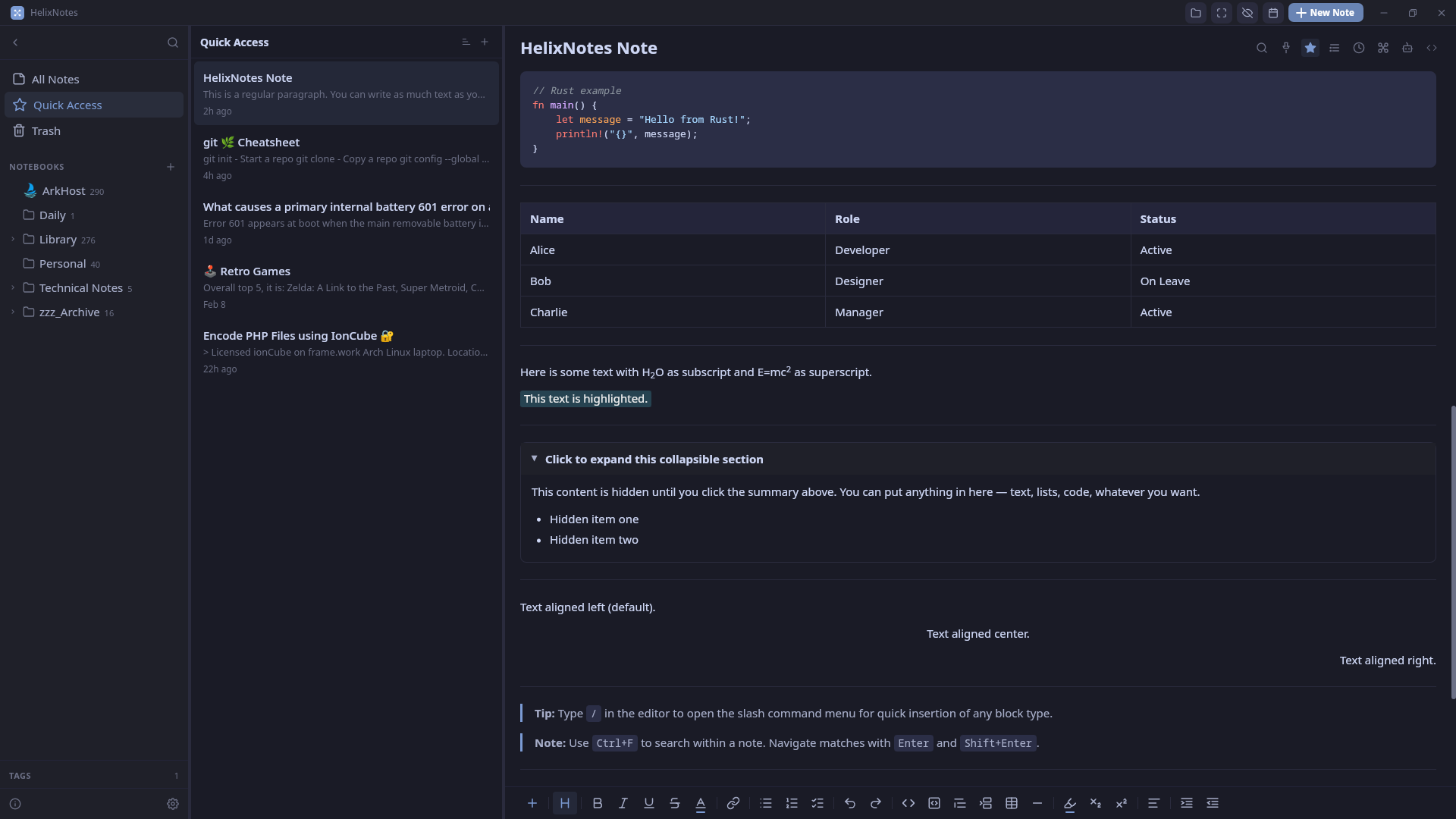 Obsidian’s default editor is barebones, you need plugins to get a usable experience. HelixNotes gives you rich editing out of the box: formatting toolbar, slash commands, source mode toggle. No setup. It’s also not Electron. Rust + Tauri 2.0 & Svelte fraction of the RAM, launches instantly. Same philosophy though: local .md files, no cloud, no lock-in. If Obsidian works for you, no reason to switch.
