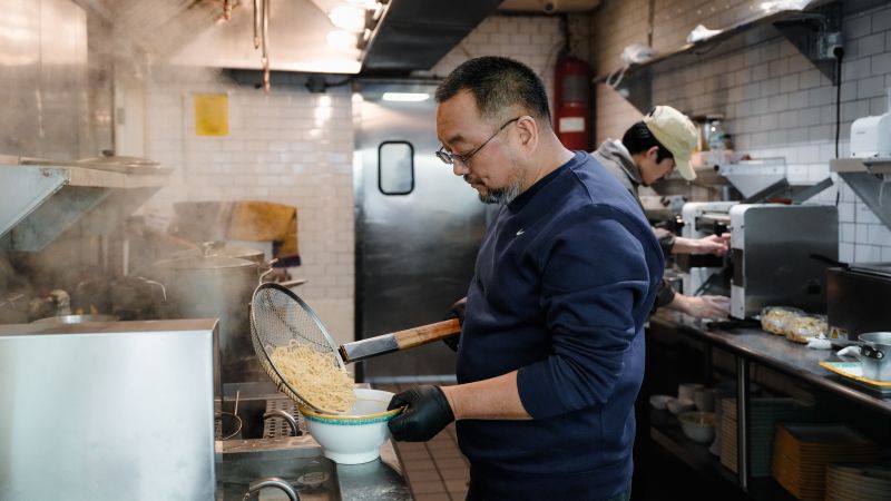 As steam rises from the stove, Ma Ruilin hand-pulls fresh noodles for the lunch service at the Chinese restaurant he runs in New York.